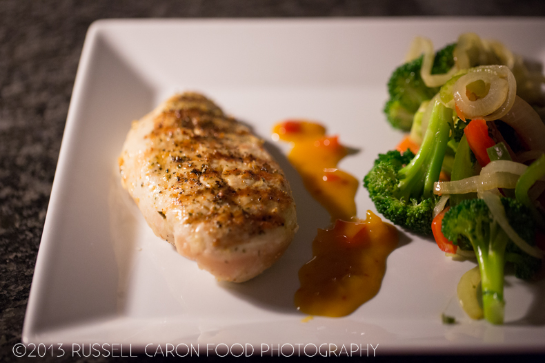 The main course presentation. A drizzle of Caribbean Mango grilling sauce complimented the spice of the chicken nicely.