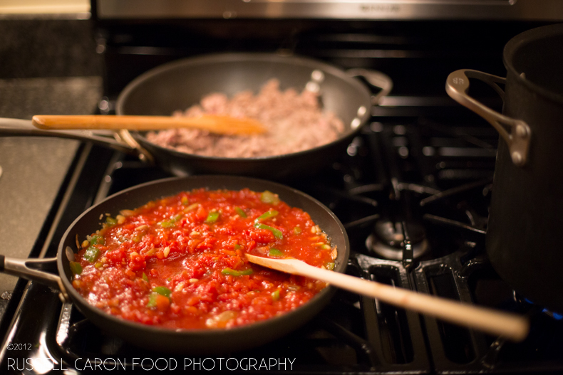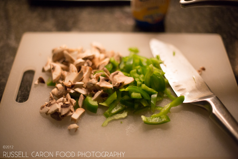 Chopping the peppers and fresh mushrooms (l).. and the sauce and meat simmering (r).