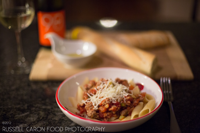 A simple meat sauce recipe uses meatball mix, pine nuts, olive oil, finely chunked tomatoes, green peppers, mushrooms, and minced garlic. Topped with Pecorino Romano, this dish is recognizable as a “grown-up” similarity to American Chop Suey.