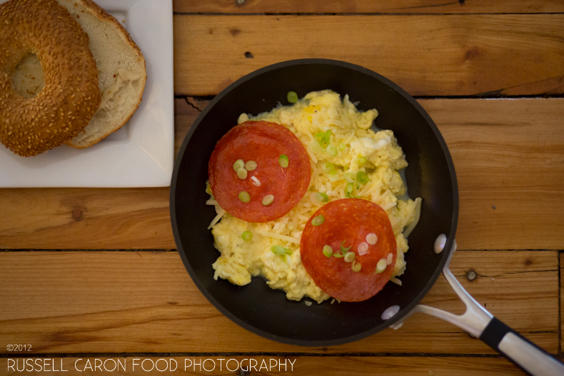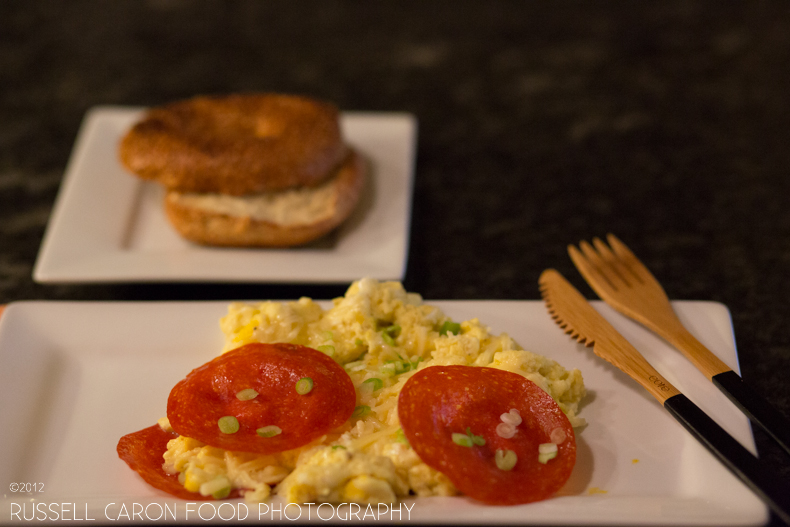 Yup, sounds odd at first. Not odd at all once you try it. The recipe is from FOOD NETWORK magazine’s recipe in the December 2012 issue, page 106. Robert Irvine’s Pepperoni and Cheese Scrambled Eggs. It’s so simple, though, you really don’t need the recipe: basically you lightly fry pepperoni. Drain and dry with paper toweling. Then cook your scrambled egg recipe… add shredded cheese and bias-cut scallions to top along with the pepperoni. Enjoy!
